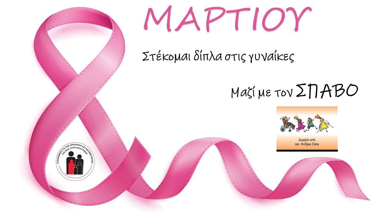 Με αφορμή την Παγκόσμια Ημέρα της Γυναίκας, 8 Μαρτίου, ο Σύνδεσμος Προστασίας κατά της Βίας στην Οικογένεια (ΣΠΑΒΟ) καλεί όλους να ενώσουν τη φωνή και τη δύναμή τους, στηρίζοντας έμπρακτα τις γυναίκες που έχουν επιζήσει από έμφυλη και ενδοοικογενειακή βία και εξυπηρετούνται από τα προγράμματά του.