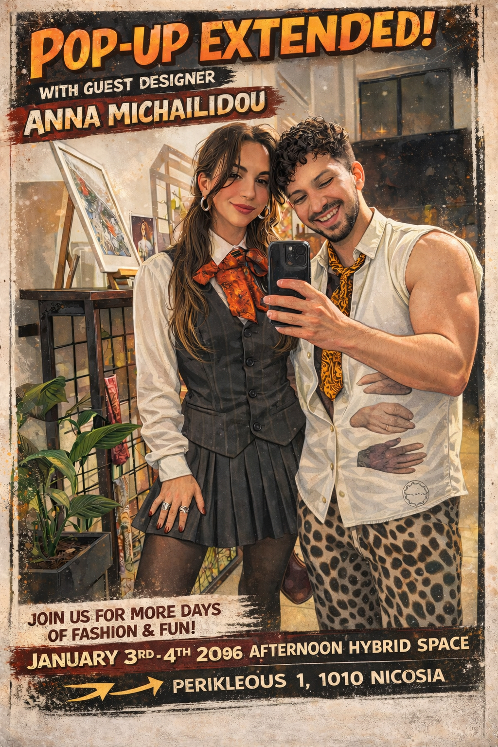 Αποκλειστικά για το Σαββατοκύριακο 3–4 Ιανουαρίου, το κοινό θα μπορεί να αποκτήσει δημιουργίες των δύο σχεδιαστών και σε ειδικούς συνδυασμούς Get the Look, προσφέροντας ολοκληρωμένες επιλογές για ιδιαίτερα δώρα και αυθεντικό κυπριακό design. Η παρουσία και των δύο δημιουργών στον χώρο δίνει την ευκαιρία για άμεση επαφή με τη φιλοσοφία και τη δημιουργική τους διαδικασία, σε ένα pop-up που λειτουργεί ως σημείο συνάντησης μόδας, τέχνης και πολιτιστικής ταυτότητας.