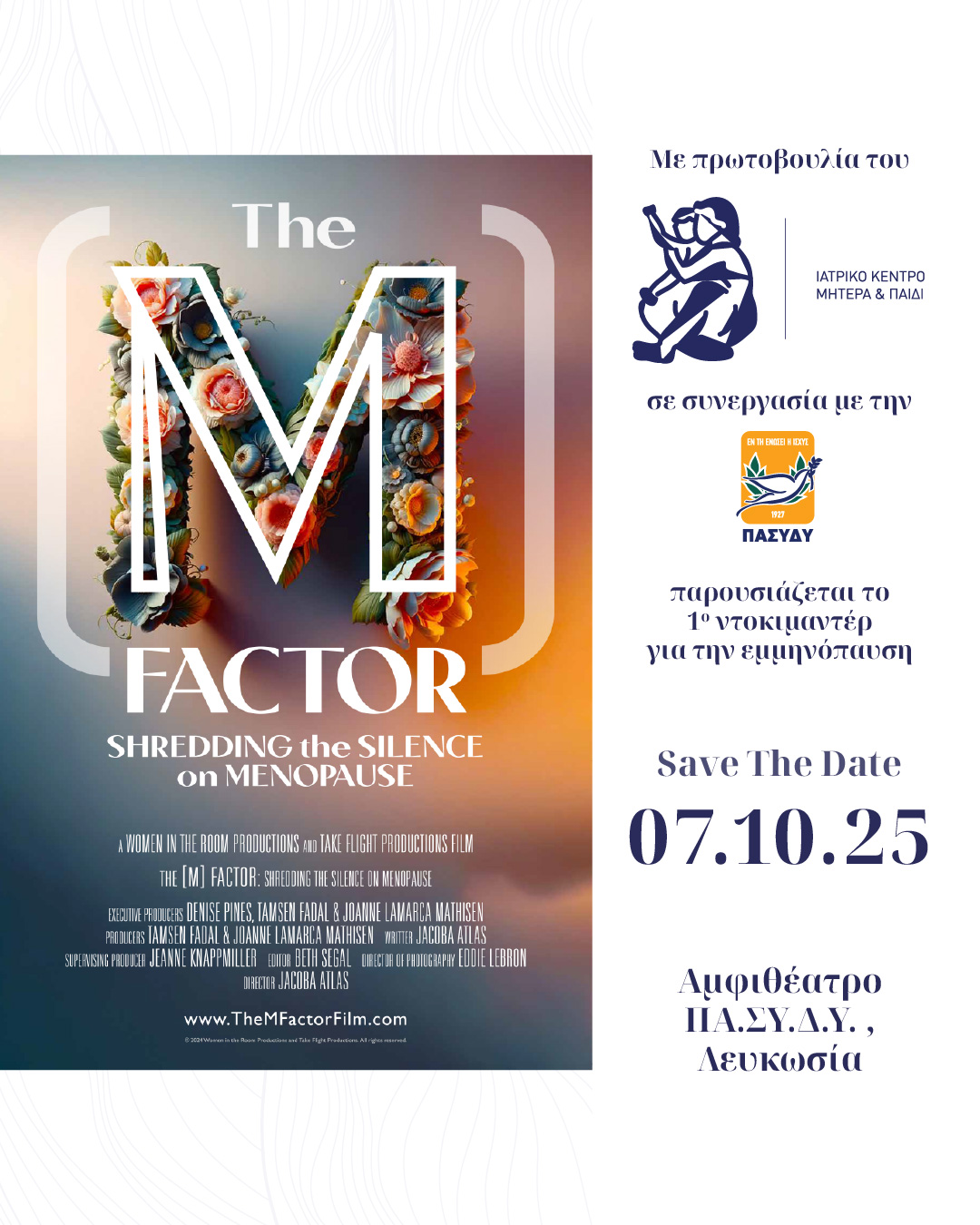 Το «The (M) Factor: Shredding the Silence on Menopause» επιστρέφει στην Κύπρο και θα προβληθεί τη Δευτέρα, 7 Οκτωβρίου, στις 17:30, στο Αμφιθέατρο ΠΑ.ΣΥ.Δ.Υ., φέρνοντας στο προσκήνιο έναν διάλογο που αφορά κάθε γυναίκα αλλά για χρόνια μένει στη σιωπή. Περισσότερο από μια ταινία, το ντοκιμαντέρ έχει γίνει αφορμή για καίριες συζητήσεις και αλλαγές στην ιατρική φροντίδα των γυναικών μέσης ηλικίας, αποδεικνύοντας ότι η ενημέρωση μπορεί να φέρει πραγματικό μετασχηματισμό. Η εκδήλωση είναι ανοικτή στο κοινό και προσκαλεί γυναίκες και άνδρες να συμμετάσχουν σε έναν διάλογο που αφορά την υγεία, την κατανόηση και την ισότητα.