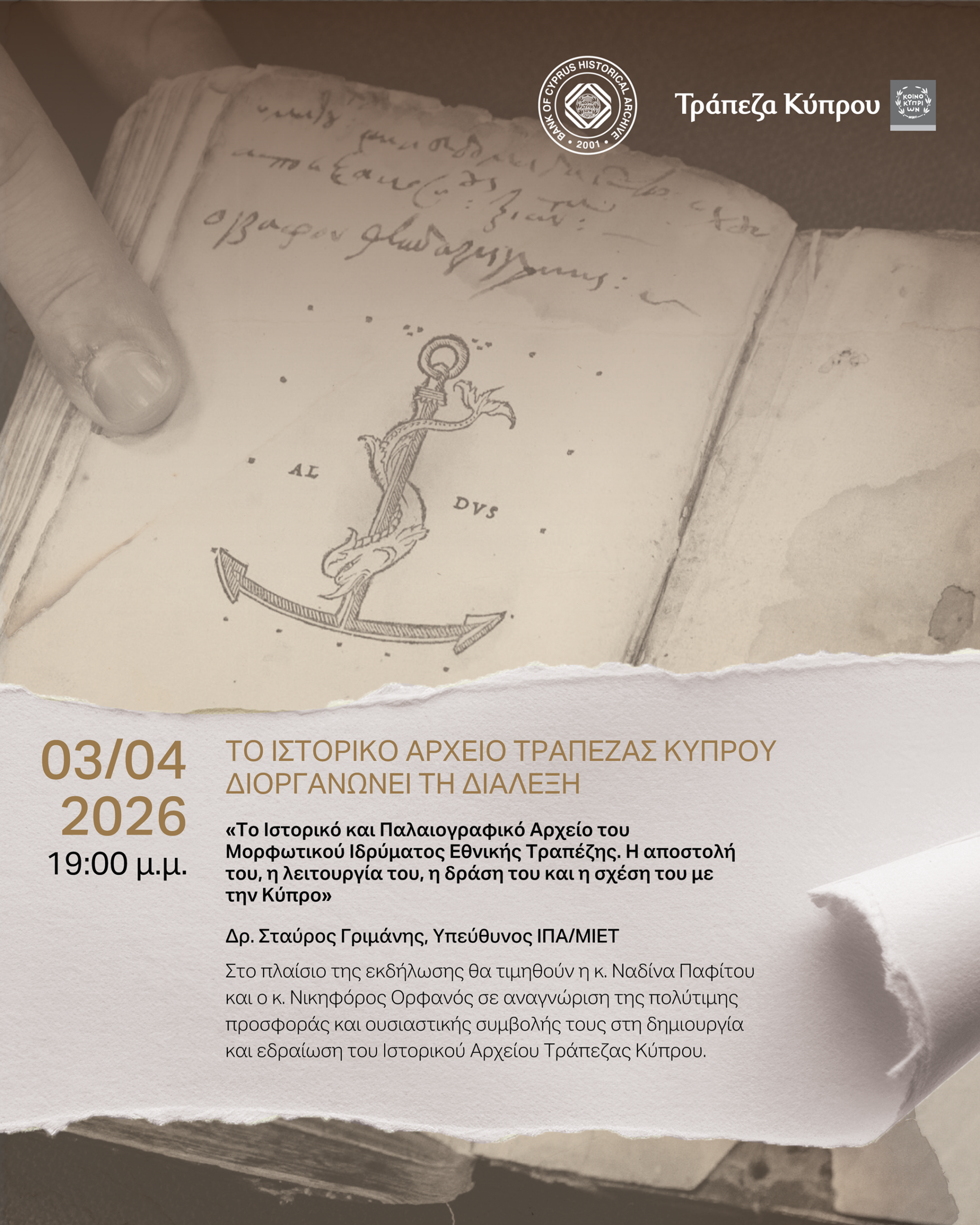 Το Ιστορικό Αρχείο της Τράπεζας Κύπρου διοργανώνει διάλεξη με θέμα «Το Ιστορικό και Παλαιογραφικό Αρχείο του Μορφωτικού Ιδρύματος Εθνικής Τραπέζης: Αποστολή, Λειτουργία και Σχέση με την Κύπρο». Ομιλητής θα είναι ο Δρ. Σταύρος Γριμάνης, υπεύθυνος του Ιστορικού και Παλαιογραφικού Αρχείου του Μορφωτικού Ιδρύματος Εθνικής Τραπέζης (ΙΠΑ/ΜΙΕΤ).