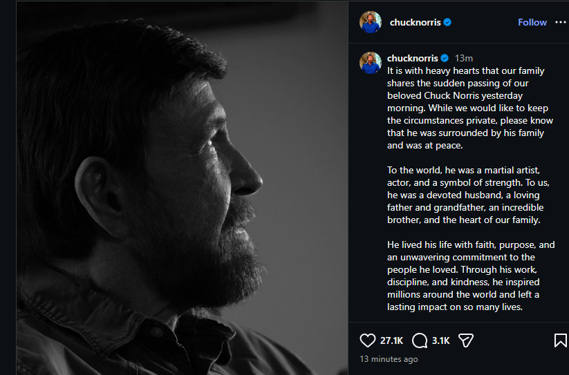 Ο θρυλικός Αμερικανός ηθοποιός και πρωταθλητής πολεμικών τεχνών Τσακ Νόρις, έφυγε από τη ζωή σε ηλικία 86 ετών, όπως επιβεβαίωσε η οικογένειά του σε ανάρτηση στα κοινωνικά δίκτυα σήμερα, 20 Μαρτίου 2026.