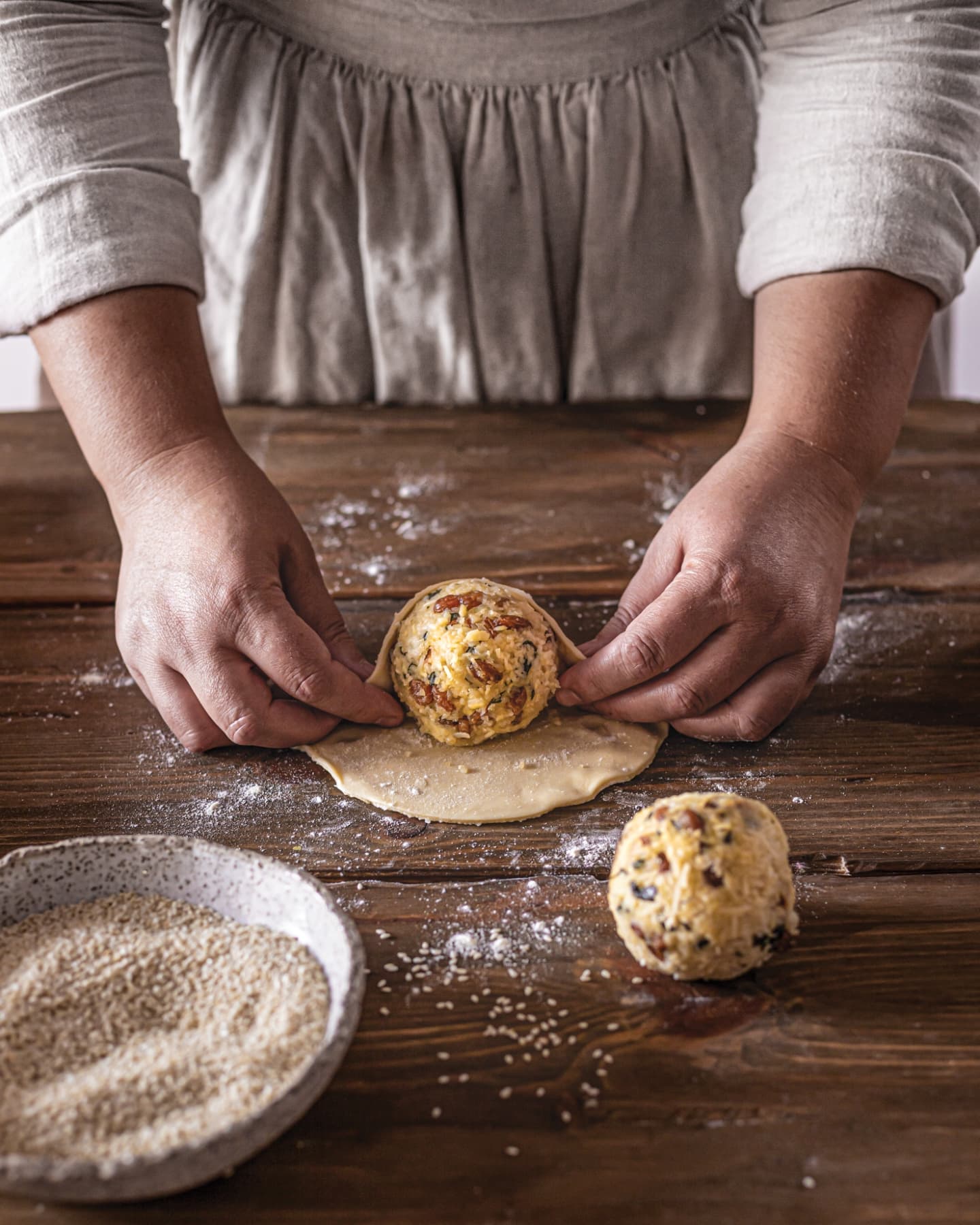 2. Βάζουμε αντικολλητική λαδόκολλα σε 2 ταψιά του φούρνου και προθερμαίνουμε τον φούρνο στους 180°C στον αέρα. Παίρνουμε 160γρ. από τη γέμιση και φτιάχνουμε μια σφικτή μπάλα. Θα σχηματίσουμε συνολικά 15 μπάλες των 160γρ.