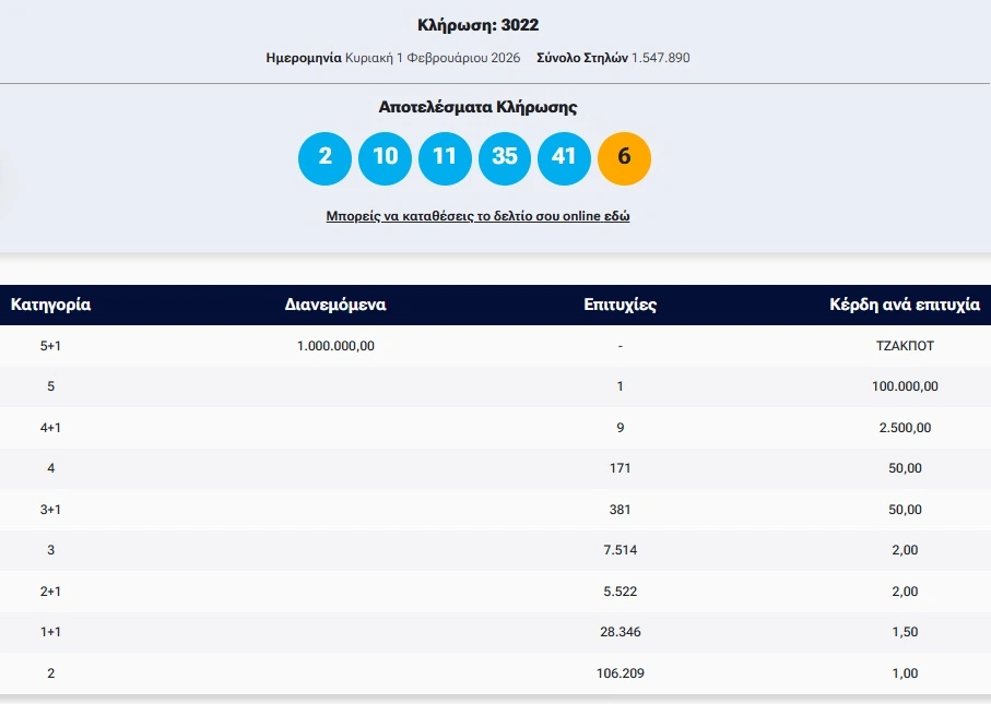 Πραγματοποιήθηκε το βράδυ της Κυριακής, 1ης Φεβρουαρίου, η κλήρωση 3022 του Τζόκερ, η οποία μοιράζει στην πρώτη κατηγορία το ποσό του 1.000.000 ευρώ.