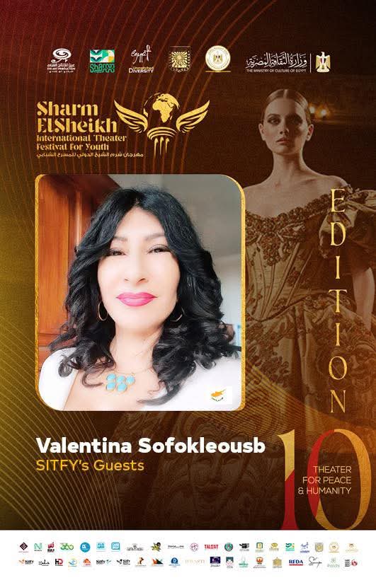 Η Κύπρια ηθοποιός Βαλεντίνα Σοφοκλέους τιμήθηκε ως Επίσημο Τιμώμενο Πρόσωπο στο 10ο Διεθνές Φεστιβάλ Θεάτρου στο Σαρμ Ελ Σέιχ, επιβεβαιώνοντας την παρουσία και την ποιότητα του κυπριακού πολιτισμού σε διεθνές επίπεδο.